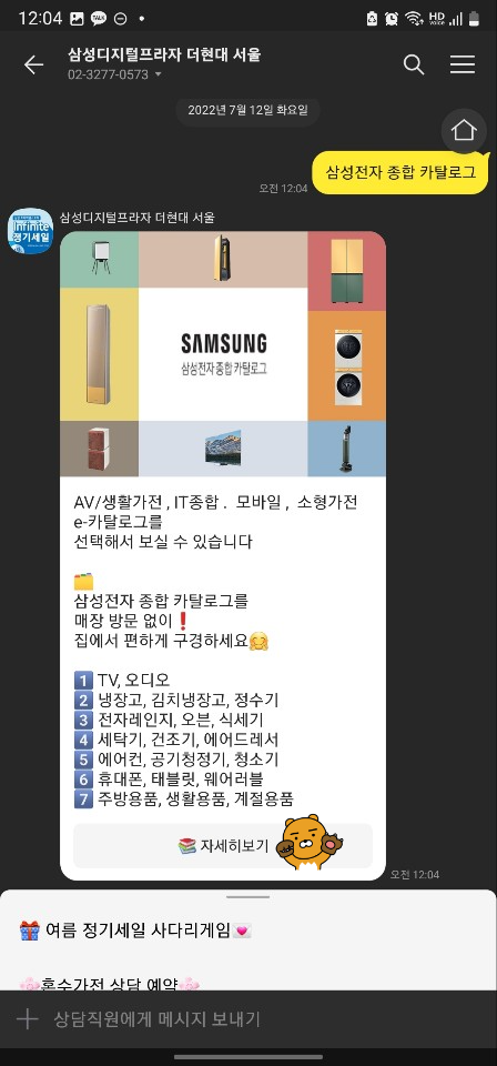 3. 삼성디지털프라자의 카톡방에 들어가서 밑의 바를 올리면 '삼성전자 종합 카탈로그'가 있다.